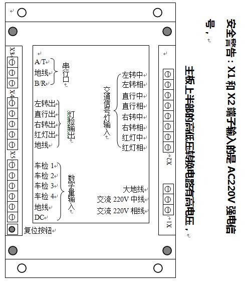 注:B型可带载8路数字量输入,参照A型接线图,只是将其中X4端子由“灯检输出”改为第二组“数字量输入”,顺序为自上至下:车检5,6,7,8,地线。